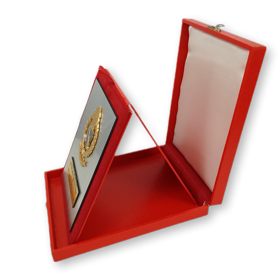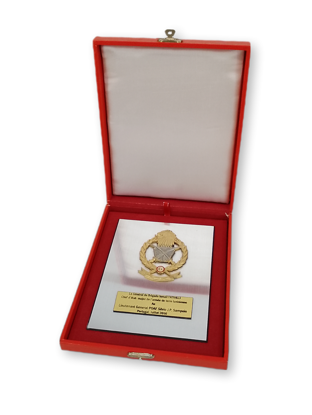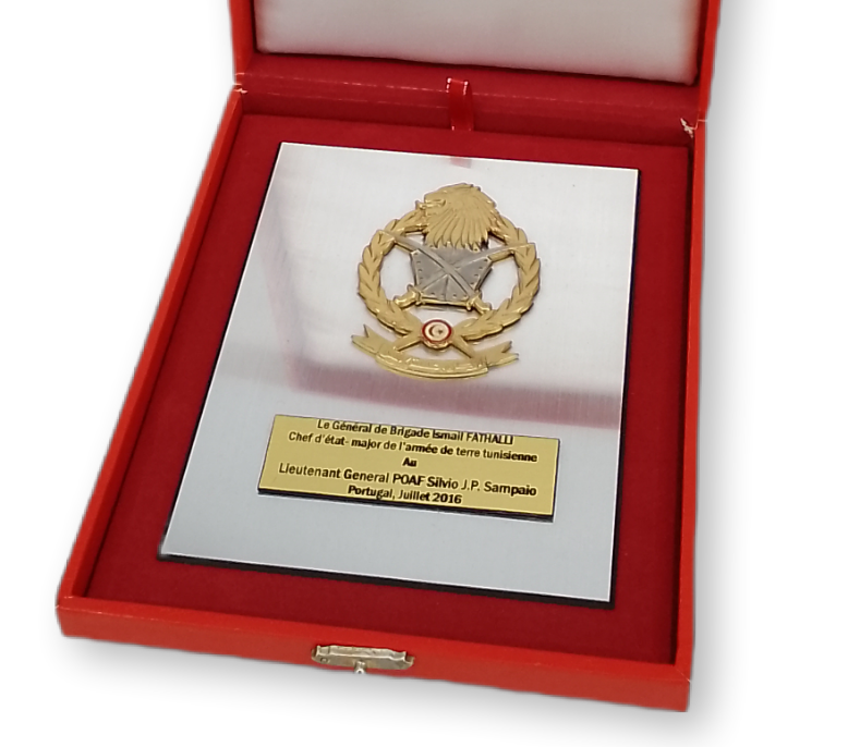 Placa em metal sobre base de cartão com suporte, em estojo. Oferta do General de Brigada Fathalli das Forças Armadas da Tunísia ao Tenente-General Sampaio em 2016.