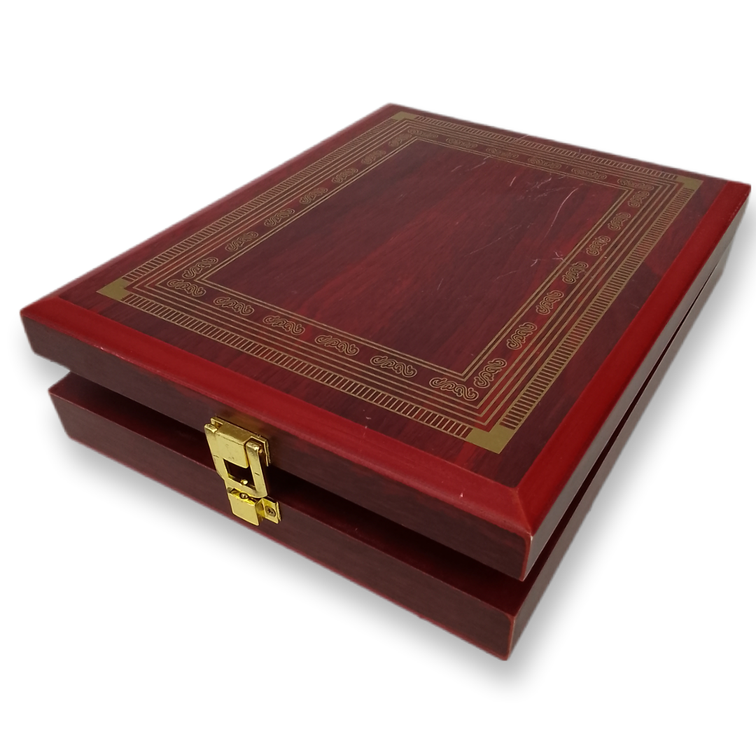 Cresta lacada e a cores em estojo decorado a dourado e interior aveludado amarelo.