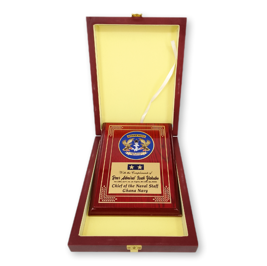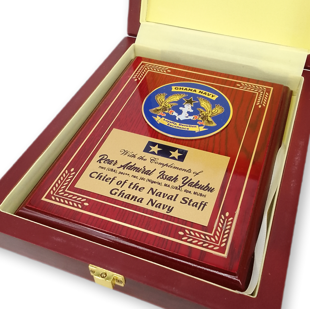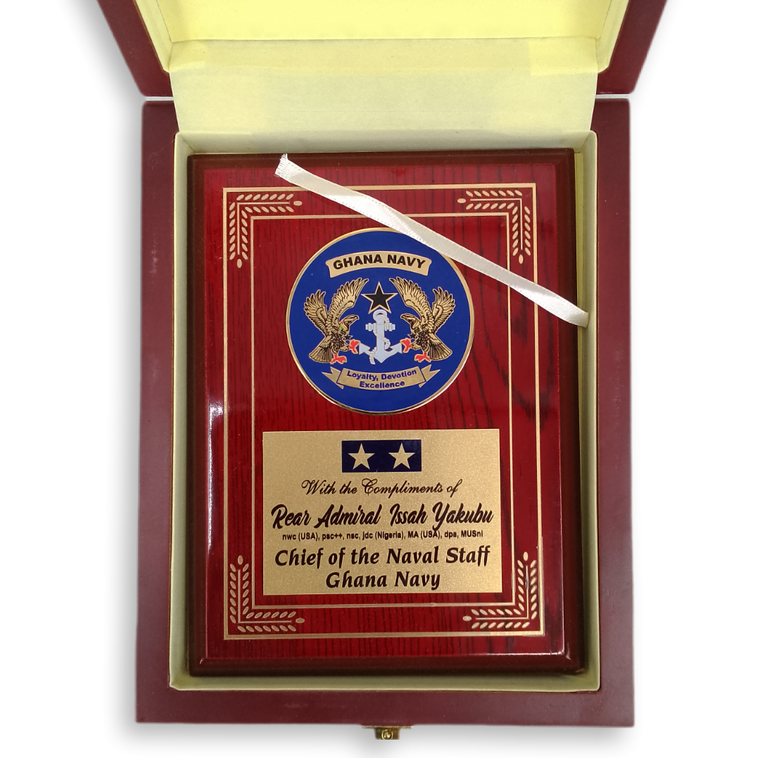 Placa oferecida pelo Contra-Almirante Issah Yakubu, que serviu como Chefe do Estado-Maior da Marinha do Gana.
