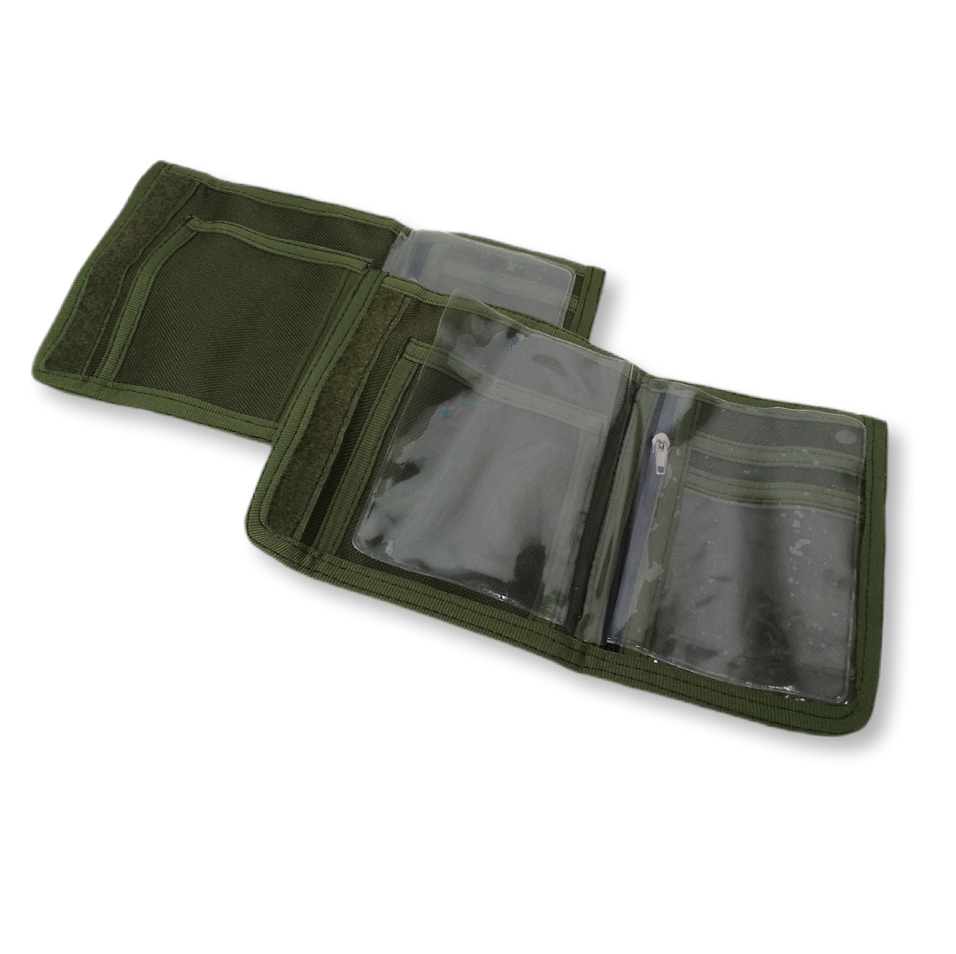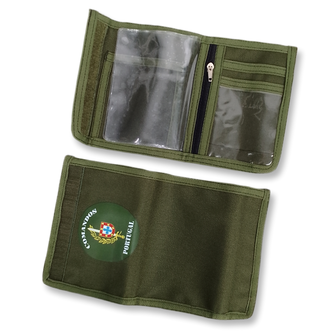 Carteira em tecido polyester, estampada, com 2 bolsas em plástico.