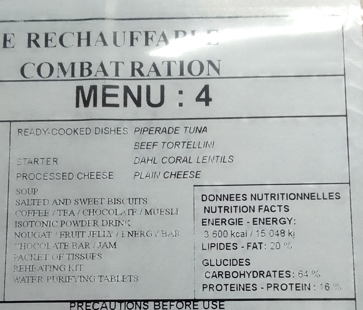Rações de combate francesas com uma refeição pre-preparada.